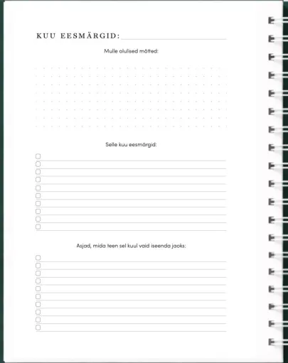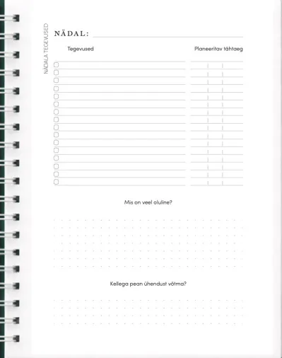 See on Eestis esimene märkmik, mis on loodud coachingu põhimõtete järgi. Lisaks planeerimisele sisaldab see ka 30+ süvitsi minevat küsimust, mis aitavad sul päriselt mõtestada oma teekonda, mitte ainult asju „ära teha“. Lisaks on iga päeva jaoks piisavalt ruumi ja päevasõnum, millega ise oma päeva häälestada.